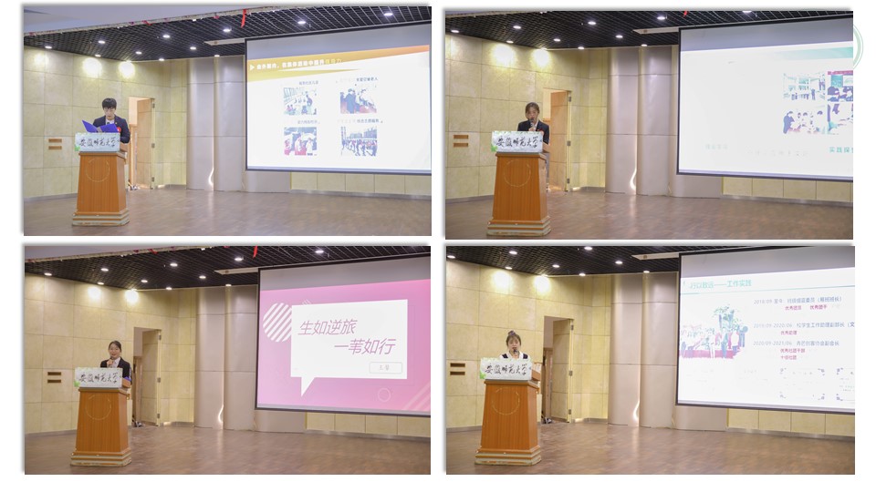 本次十佳大学生汇报采取线下观摩与线上直播相结合的方式进行,18位候选人通过PPT展示,结合自身思想、学习、工作、实践等经历与成果进行汇报。2018级学前教育专业刘玉瑾以“从学前出发,行志愿道路”展开汇报,他强调新时代大学生应坚守初心,把握方向,拓展维度,立大志,明大德,投身志愿服务,彰显时代担当。奋斗为浆,踏浪而行,2018级教育学吕可在汇报中介绍了她在大学四年生活中理想信念建设、专业技能培养、志愿服务实践等方面的具体情况,她认为热爱可抵岁月漫长,要坚持做一个勤奋、沉稳与热爱的教科人。