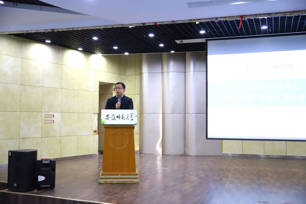 徐赟在现场点评中对获得“教科之星”十佳大学生称号的同学表示祝贺,肯定了他们取得的优异成绩。他指出,获奖同学应心怀感恩,身担责任,以身作则,积极展现学院风范,希望广大教科学子向榜样看齐,强自身实干,提升素质修养,争当教科之星。李宜江为获得“教科之星”十佳大学生颁发荣誉证书与奖金。
