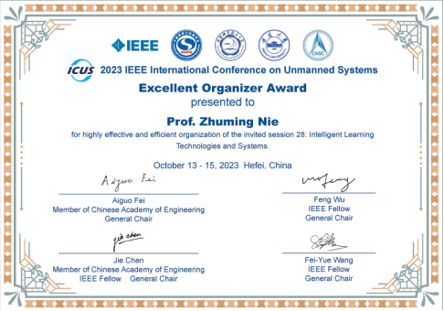 2023年10月13日-15日,第六届IEEE国际无人系统大会(IEEE ICUS 2023)在合肥召开。此次会议由中国指挥与控制学会、IEEE南京分会主办,中国科学技术大学、中国航天科技集团有限公司第九研究院第九设计部、中国指挥与控制学会无人系统专业委员会等承办。费爱国院士、中国科学技术大学副校长吴枫教授以及来自北京大学、清华大学、新加坡南洋理工大学、澳大利亚皇家墨尔本理工大学等300余位专家学者现场参会。