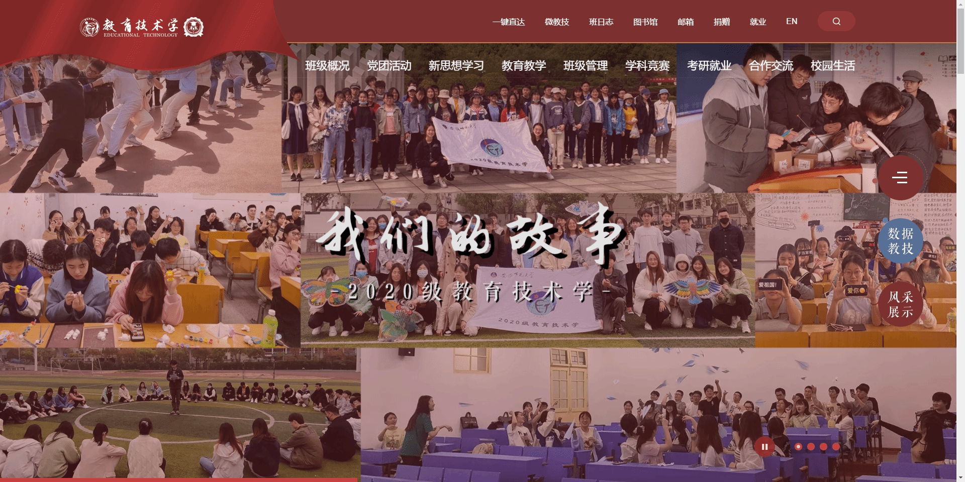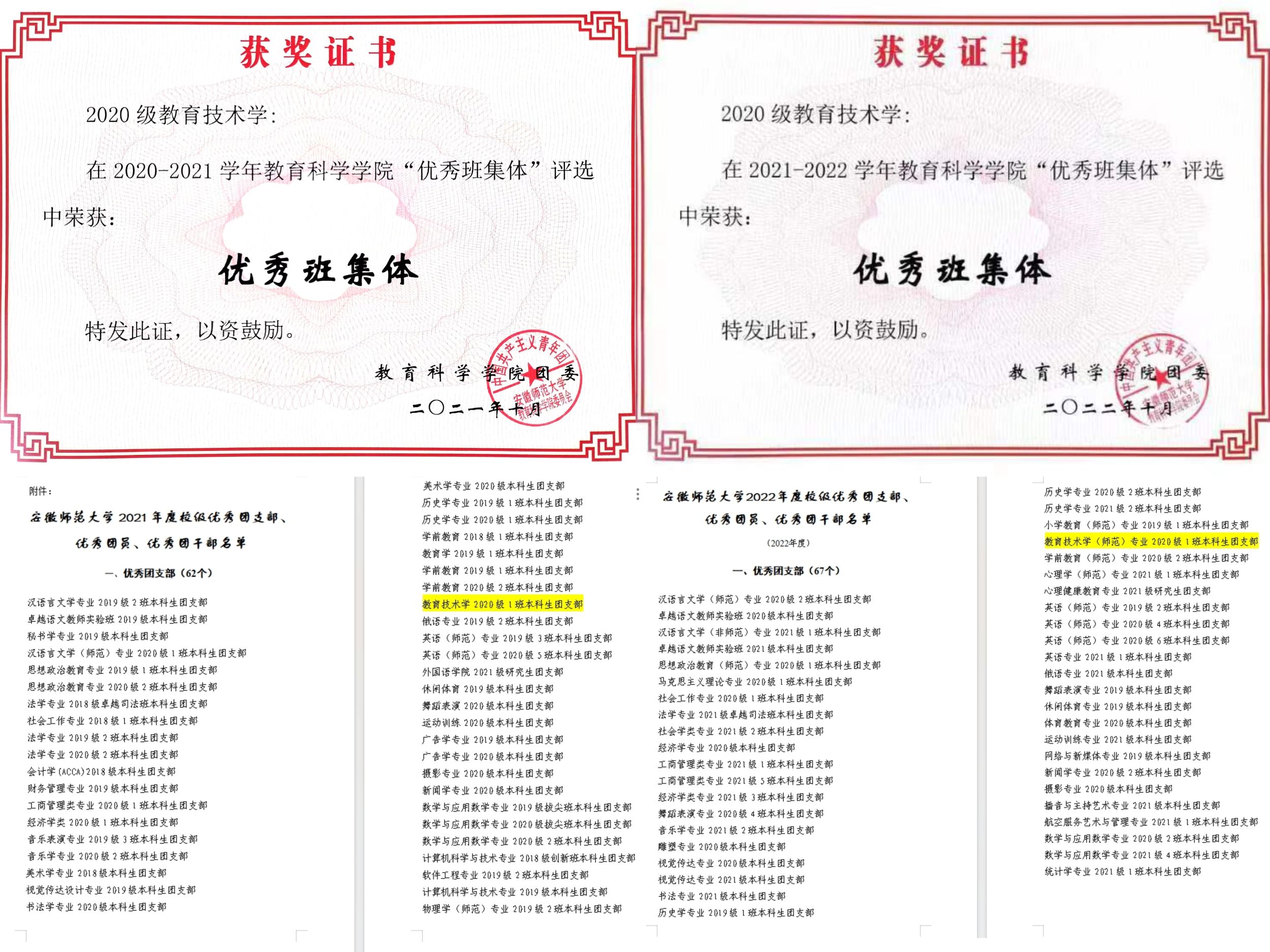2020级教育技术学1班现有44名同学,班级同学积极上进,团结奋进,勇攀高峰。班级围绕“崇德·博学·笃行·创新”的班训开展各项工作,连续两年获评院级“优秀班集体”,所在团支部连续两年获得校级“优秀团支部”称号。班级积极投身社会实践,其中1支队伍入选团中央“七彩假期”项目,1支队伍入选安徽省少先队实践营项目,并新建1个大学生社会实践基地。