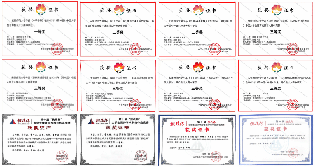 班级扎实推进学风建设,获得多项专业技能证书,两人分别获长三角师范生技能大赛二、三等奖。中国计算机设计大赛国家级获奖26人次,校级及以上获奖130人次,国奖数量居全校第一,其中作品《本草·寻踪》获国家级一等奖。第十届“挑战杯”安徽省大学生课外学术科技作品竞赛“黑科技”专项包揽全院4项省级奖项。