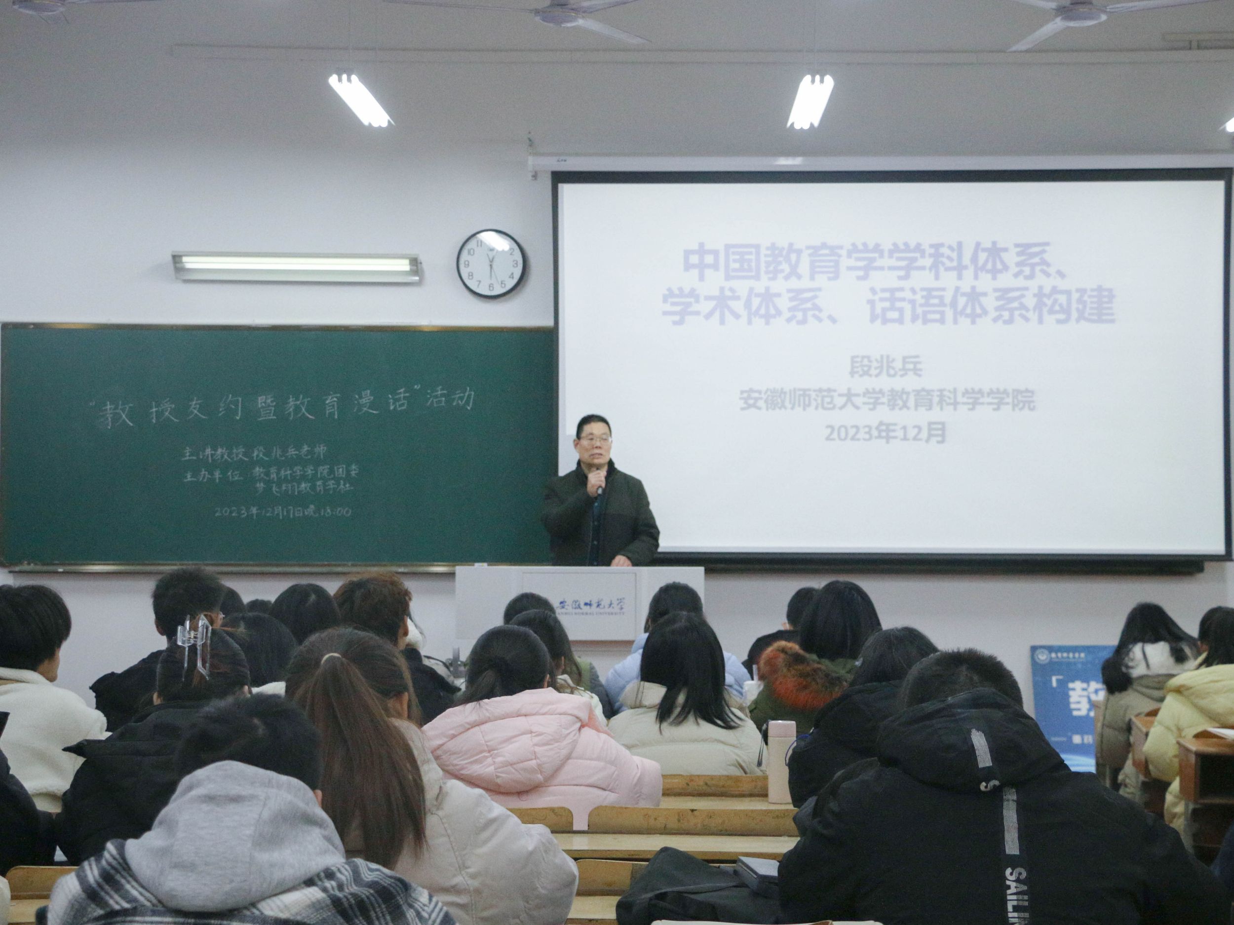 12月17日晚,HJC黄金城登录在赭山校区教学楼1403教室组织开展第三十期“教授友约”活动。本次活动邀请教育学专业博士生导师、教授段兆兵老师到场,为同学们做关于“中国式教育学的学科体系、学术体系、话语体系及其构建”方面的分享。