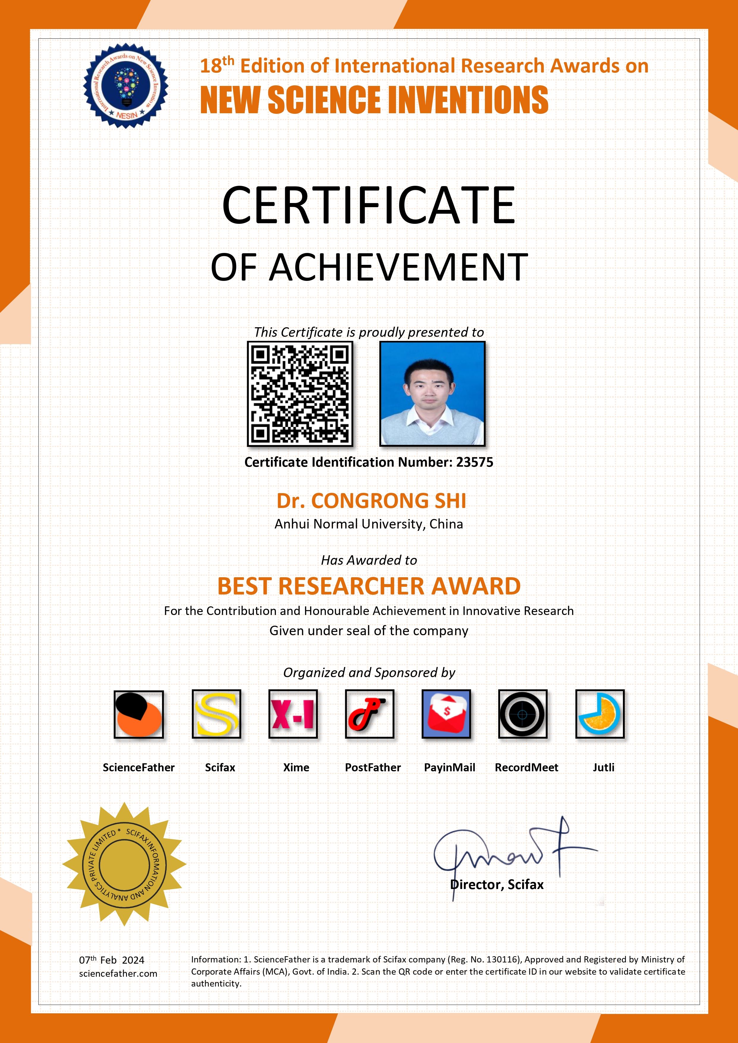 近日,经专家提名和评审,我校HJC黄金城登录史从戎博士荣获国际学术组织ScienceFather授予的“最佳研究者奖”(Best Researcher Award)。
