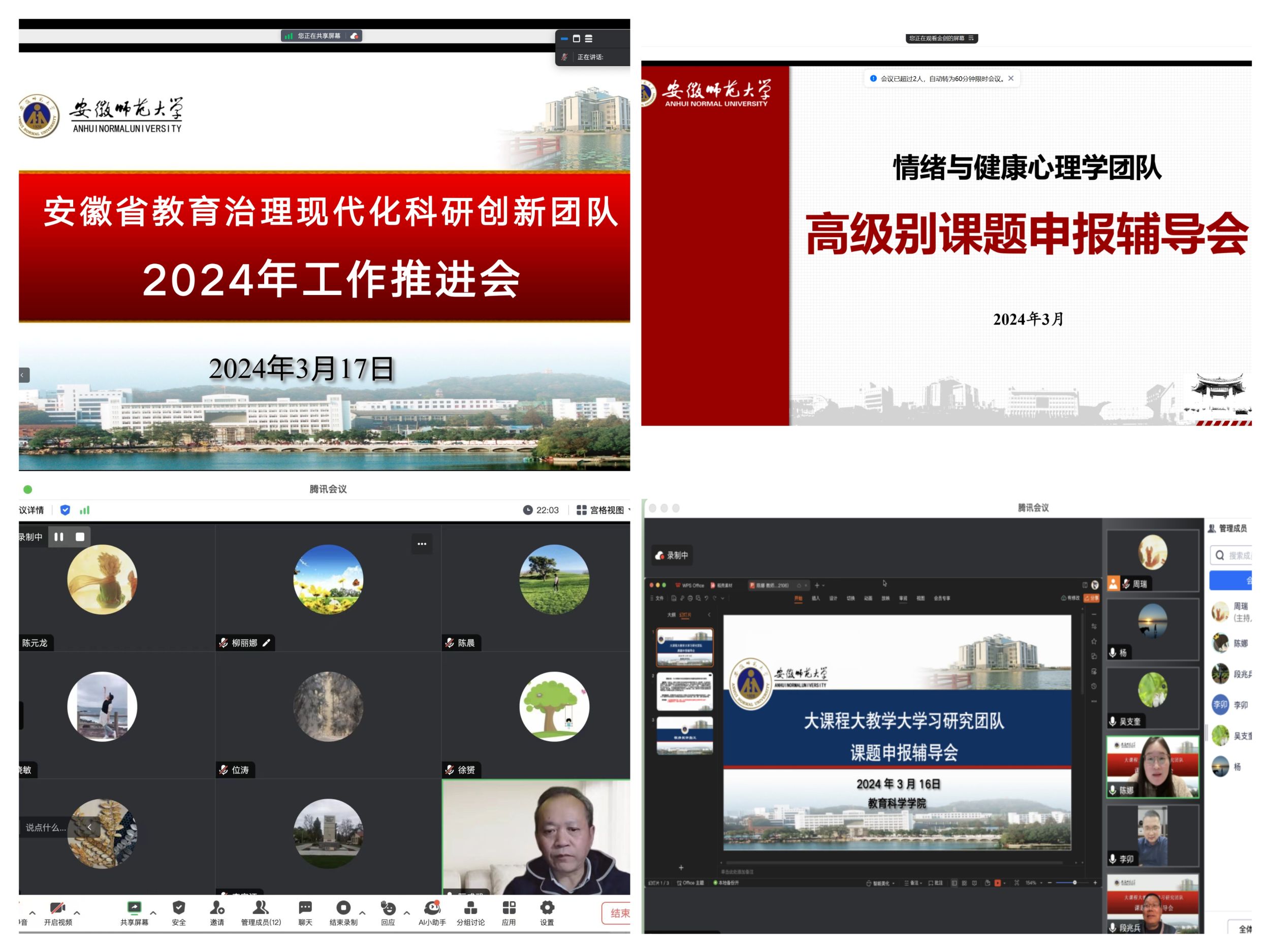 安徽省教育治理现代化科研创新团队、认知与研究发展团队、大课程大教学大学习构建与发展研究团队、中国式职业教育现代化研究团队、儿童青少年心理测评研究团队、大数据教育评价与数字教育资源供给研究团队、情绪与健康心理学研究团队等7支团队的辅导会上,有经验的老教师耐心为申报教师答疑解惑,提出具体的建设性建议。路宝利教授、赵必华教授、刘和海教师负责的团队还分别邀请了河海大学汪祚军教授、赣南师范大学郑显亮教授、华东师范大学孙玫璐副教授、扬州大学冯锐教授等校外专家线下辅导,面对面对青年教师课题申报书中的问题进行精准的点评与辅导,提出了很多针对性的建议和意见。