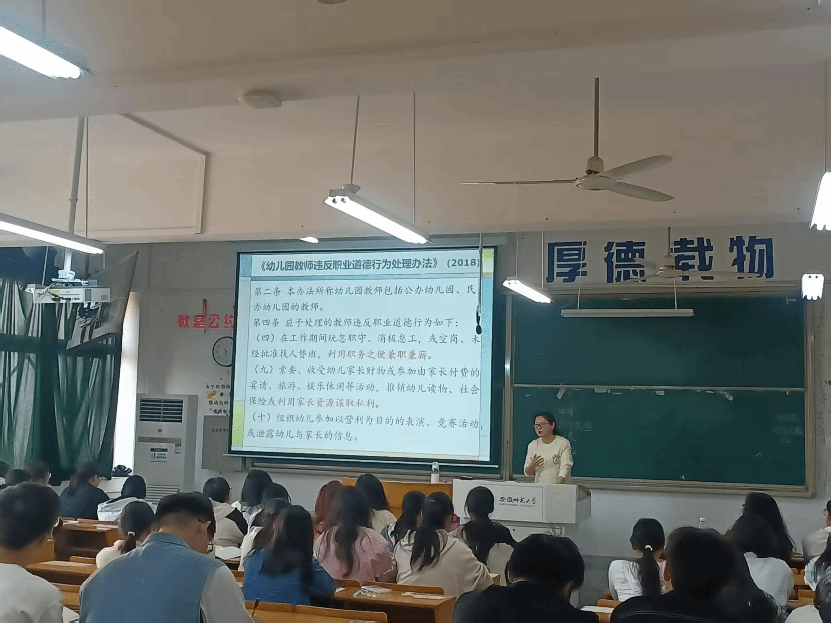 4月8日上午,本学期本科教学观摩示范课在赭山校区HJC黄金城登录8202教室举行,我院学前教育专业张志华老师围绕《教师职业道德修养》的相关内容展开了一场富有哲理的授课。学校教学督导团、学院领导及部分青年教师观摩了此次公开课。