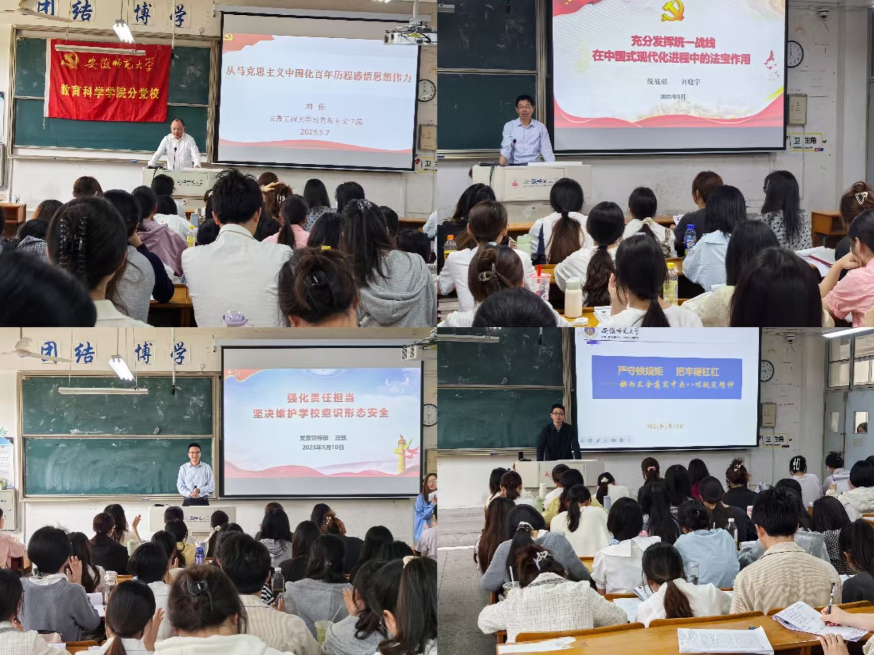 本期党员教育培训班共开展4次理论授课,多位专家老师结合主题为学员们带来精彩丰富的课程。安徽工程大学马克思主义学院党委书记刘伟以“从百年党史中感悟马克思主义中国化的真理伟力”为主题,带领大家深入学习习近平新时代中国特色社会主义思想内涵;校党委统战部常务副部长刘晓宇给大家解读了统一战线在中国式现代化进程中的法宝作用;校党委宣传部常务副部长汪凯带领大家学习《强化责任担当,坚决维护学校意识形态安全》,要求大家筑牢思想防线,在政治上保持坚定、在理论上有清醒认知;纪委办公室案管审理室主任刘长生带领大家深入贯彻中央八项规定精神学习教育,告诫学员们绷紧纪律之弦,做合格党员。理论课程的学习不仅增强了学员对党的理论知识的理解,同时也进一步锤炼党性修养。