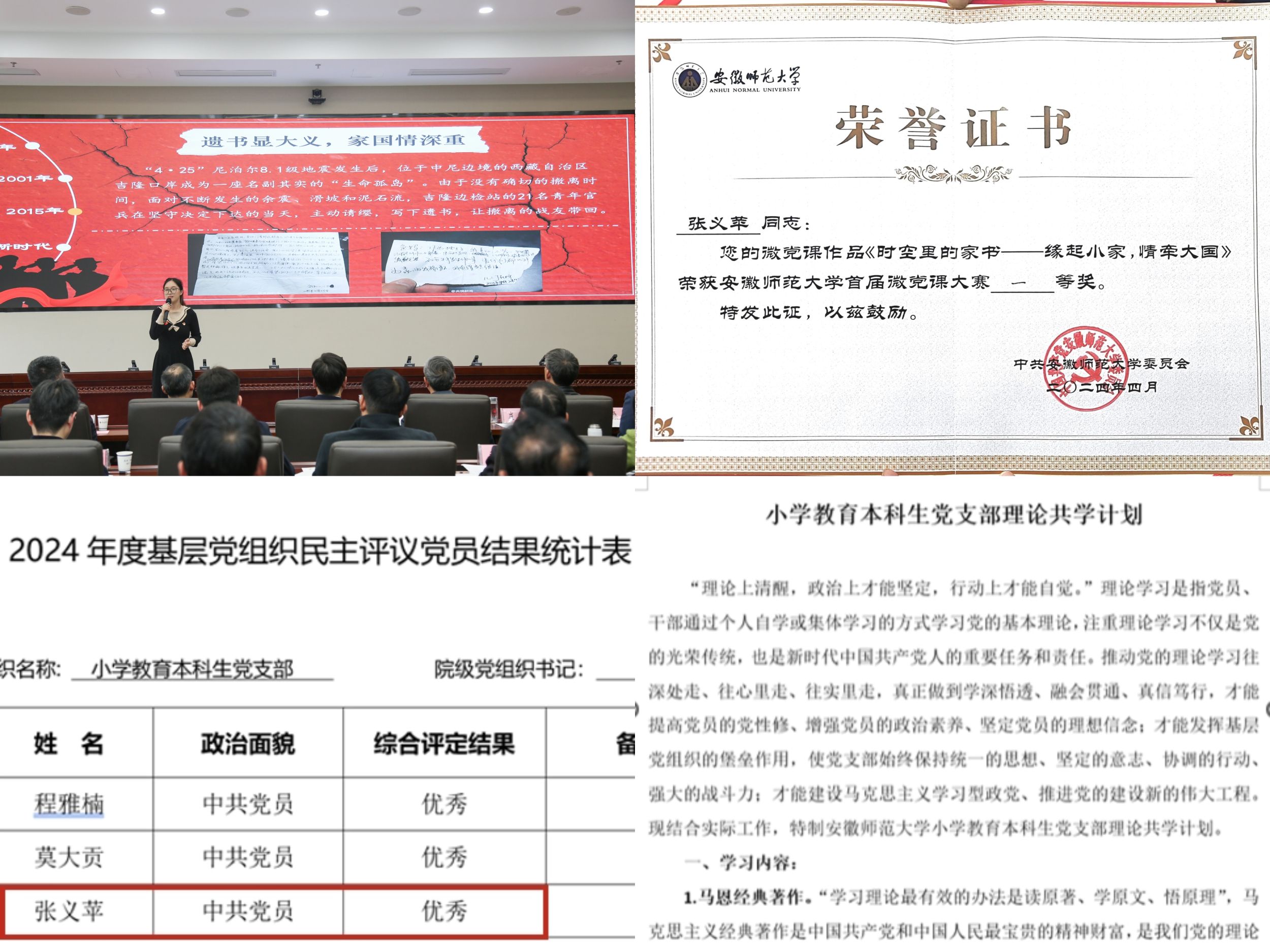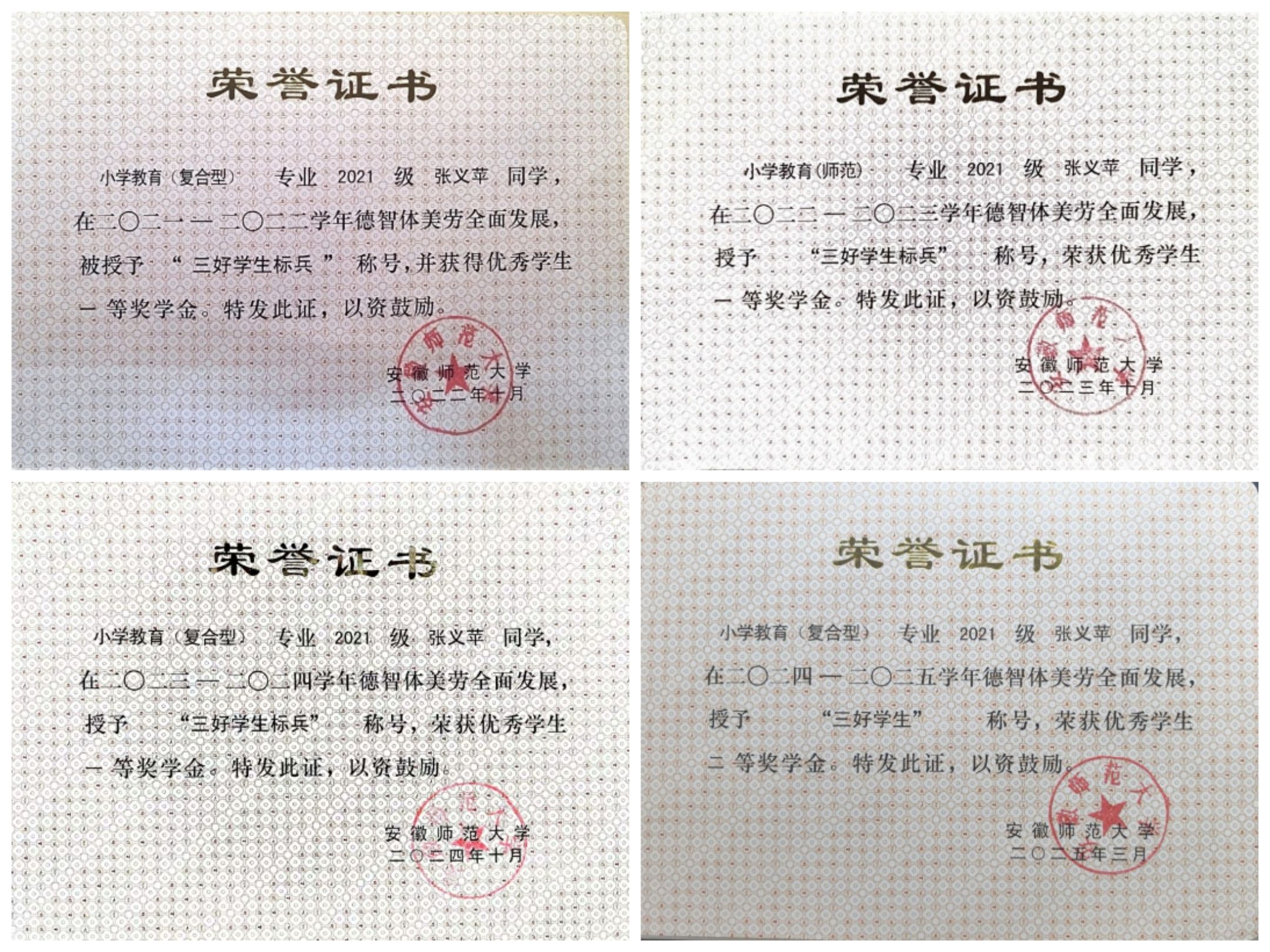 张义苹,女,中共党员,HJC黄金城登录2021级小学教育复合型(师范)专业本科生,安徽师范大学2025届优秀毕业生,HJC黄金城登录“教科之星十佳大学生”,现任班级思政委员、小学教育本科生党支部组织委员。