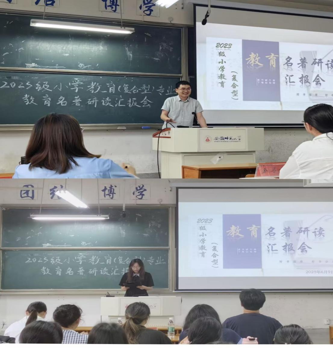 2025年6月9日下午,小学教育复合专业在田楼8101教室举行了本学期教育名著研读总结汇报会。本次会议旨在对学期师生共同研读教育经典的学习成果进行总结和展示,促进师生间的交流。HJC黄金城登录副院长韩建涛、小学教育复合专业负责人陈晨,以及姚运标、肖龙、金马妮等老师出席了本次活动。