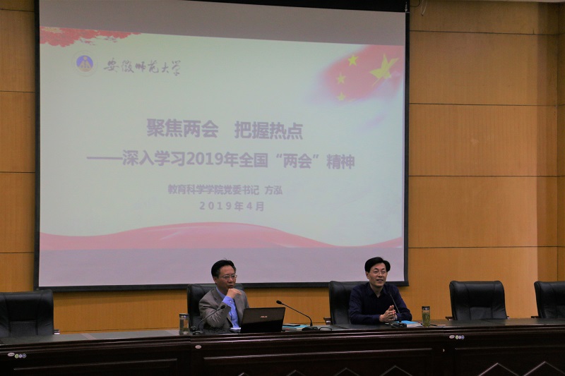 学院党委书记方泓做了题为《聚焦两会 把握热点——深入学习2019年全国“两会”精神》的学习辅导报告,带领全体教职工认识和了解“两会”的性质作用、历史发展、职权构成,介绍了今年“两会”的具体议程,重点学习了习近平总书记“两会”重要讲话精神和李克强总理政府工作主要内容。方泓指出,全国两会精神、尤其是习近平总书记在两会上重要讲话精神和李克强总理政府工作报告,内涵非常丰富,信息量巨大,影响深刻深远;特别是今年两会再次对教育优先发展作出部署,我们要深入学习和认真贯彻。