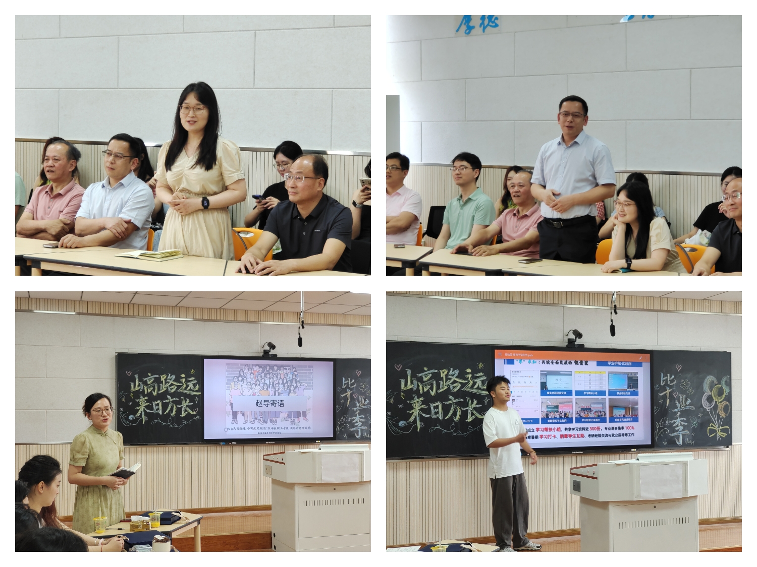 视频之后,由生活委员贺金霞在班群发拼手气红包,手气王程琳、何禹天发表四年感言,感慨本科生涯带给自己的成长以及对师长的诚挚感谢。然后,各个小组代表依次发表了毕业季感言,包括对小组成员的不舍、对指导教师的感谢及对专业培养的感恩。其中,咸欢欢在讲话时一度哽咽,表示观看班级回忆视频时,过去的一幕幕场景在脑海中再现。紧接着,小组指导教师阮成武分享为同学们大一上课时的场景,结合建党百年、轻轨通车等重要节点,围绕“山高路远”阐释了自己的理解与对同学们的期许。杨俊铨以“同窗”名义分享自己指导完成第一届本科生的些许感动。陈元龙谈到今天的话别不是终点,而是新旅程的起点,希望同学们在更广阔的天地绽放光彩。柳丽娜建议同学们把本科经历总结成经验,为将来的成长服务,帮助自己越走越远。