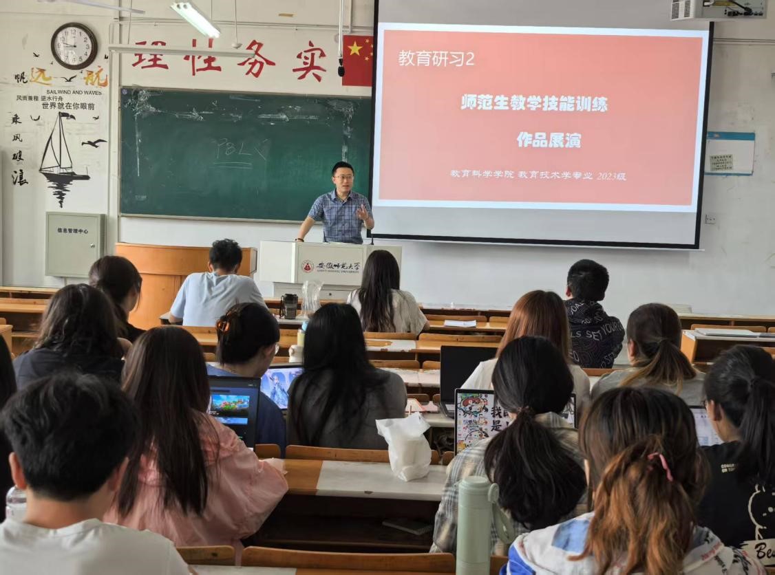 夏日蝉鸣渐起,教学相长正当时。为扎实培养师范生教学技能,搭建教育理论与教学实践的桥梁,6月20日上午9点,在杨滨老师的悉心组织与全程指导下,2023级教育技术学专业教育研习2暨师范生教学技能展演于田家炳教学楼8203教室顺利开展。