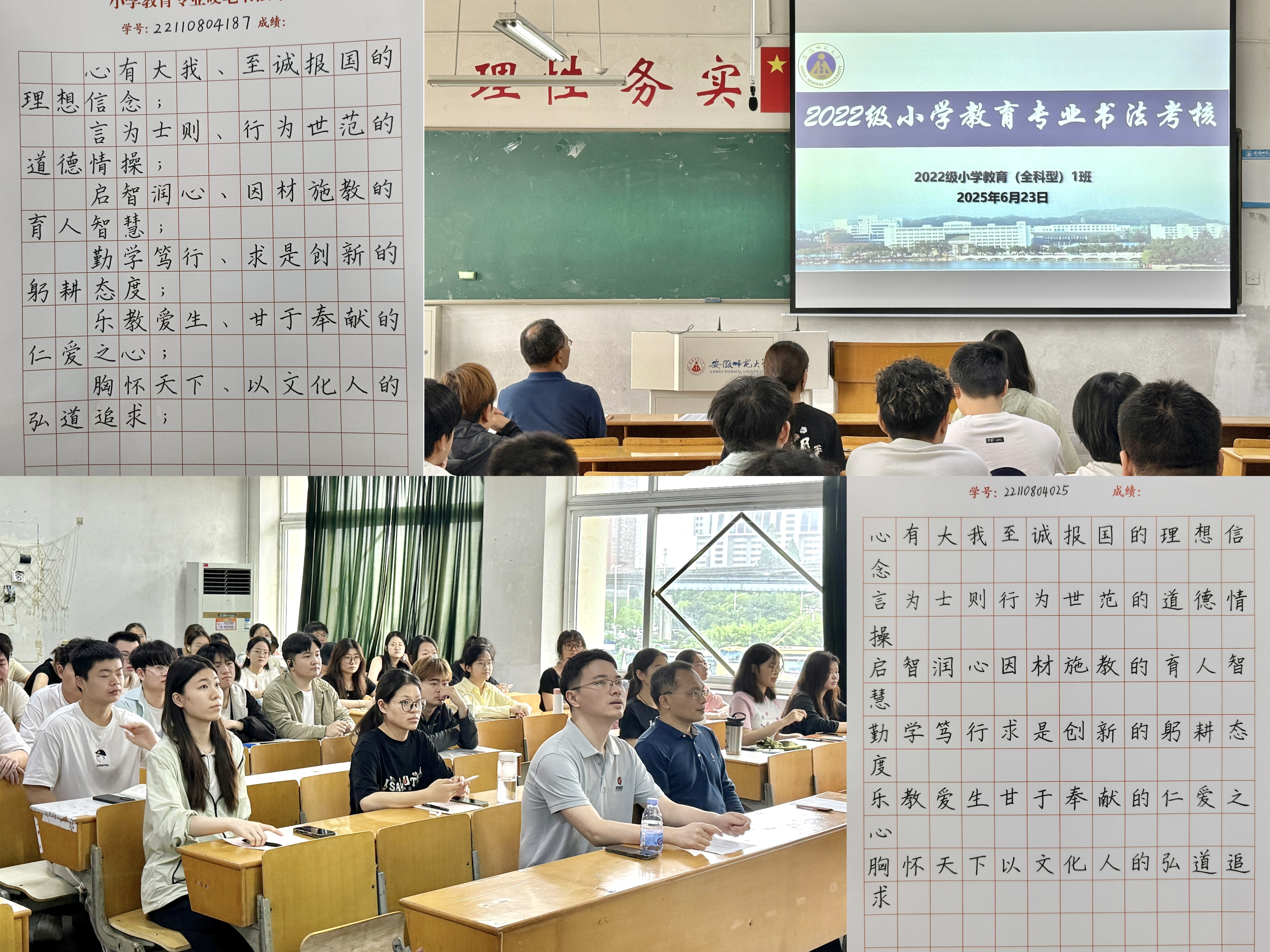 2025年6月23日上午9时,2022级小学教育(全科型)专业书法考核在学院顺利开展。本次考核评委由专业负责人王芳及班主任老师组成,对全体学生的硬笔书法和粉笔字进行综合评定。