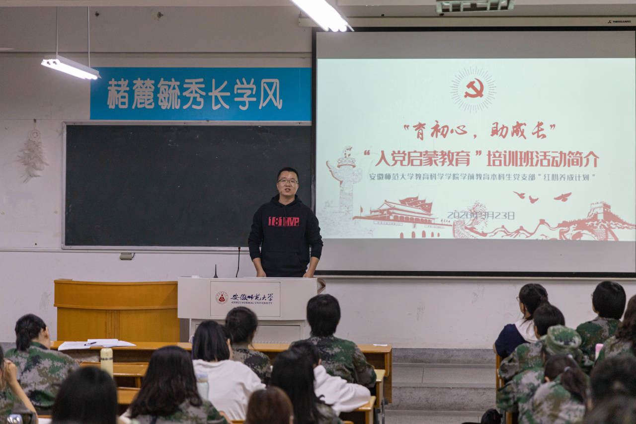 本网讯(教科院 彭少斌 龚伟)为帮助2020级学前教育专业新生更好了解“入党启蒙教育”,推动学院学生党建工作的顺利开展,9月23日晚,第四期“入党启蒙教育”培训班宣讲活动在田楼8402教室顺利举行。本次活动由2019级入党积极分子薛敏主持,学前教育专业本科生党支部书记龚伟老师、2020级学前教育专业辅导员蔡文老师、“驻班党员”“先锋导员”以及全体2020级学前教育专业学生参与了活动。